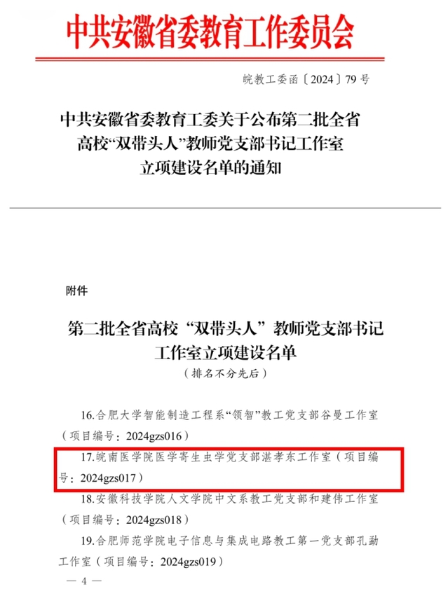 近日,安徽省委教育工委公布了第二批全省高校“双带头人”教师党支部书记工作室立项建设名单,伟德国际1946源于英国基础医学院党委医学寄生虫学党支部湛孝东工作室名列其中,这是继伟德国际1946源于英国获批省级党建工作示范高校、标杆院系、样板支部后,党建工作结出的又一硕果,实现了省级高校党建“双创”项目全覆盖。