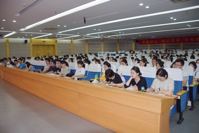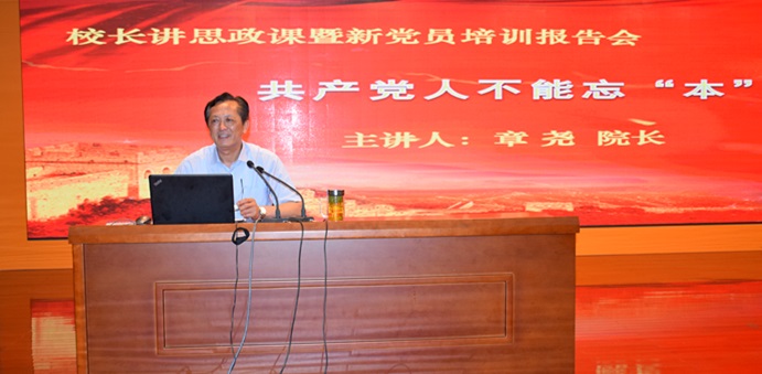 为庆祝中国共产党成立98周年,增强新党员党性意识,2019年7月1日晚,党委副书记、院长章尧教授在图书信息大楼三楼报告厅为三百多名学生党员和学生党支部书记上了一堂题为“共产党人不能忘本”的思想政治理论课,思想政治理论课由组织部部长方国庆主持。