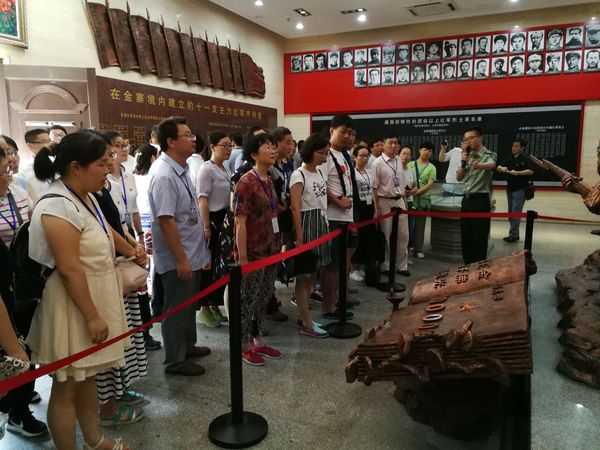 7月10日上午,培训班充分依托金寨县红色教育资源进行现场教学,学员们来到金寨县红军广场,向革命烈士纪念塔敬献花圈,重温入党誓词,瞻仰了红军纪念堂,参观了红军烈士墓园和革命博物馆。“一寸山河一寸血,一抔热土一抔魂”,聆听着讲解员对金寨县革命史的详细介绍,瞻仰着一件件红军革命历史文物和图片,大家仿佛置身于那个烽火燎原的战争时代,心潮澎湃,深受鼓舞,纷纷表示将沿着革命先烈的足迹继续前进,继承革命先烈遗志,发扬新时代“红军精神”,增强“四个意识”,坚定理想信念,牢固树立宗旨意识,发挥党员先锋模范作用和党支部战斗堡垒作用。