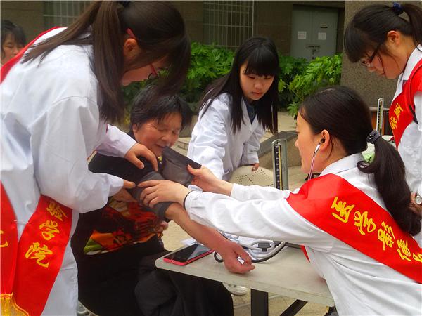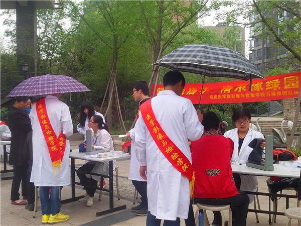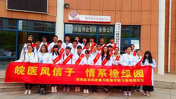 为大力弘扬志愿服务社会的皖医精神,2015年4月18日上午,医学影像与检验学院组织党员走出校园,在地大橡树园、春江绿岛等小区开展以“皖医风信子 情系橡绿园”为主题的义诊活动。