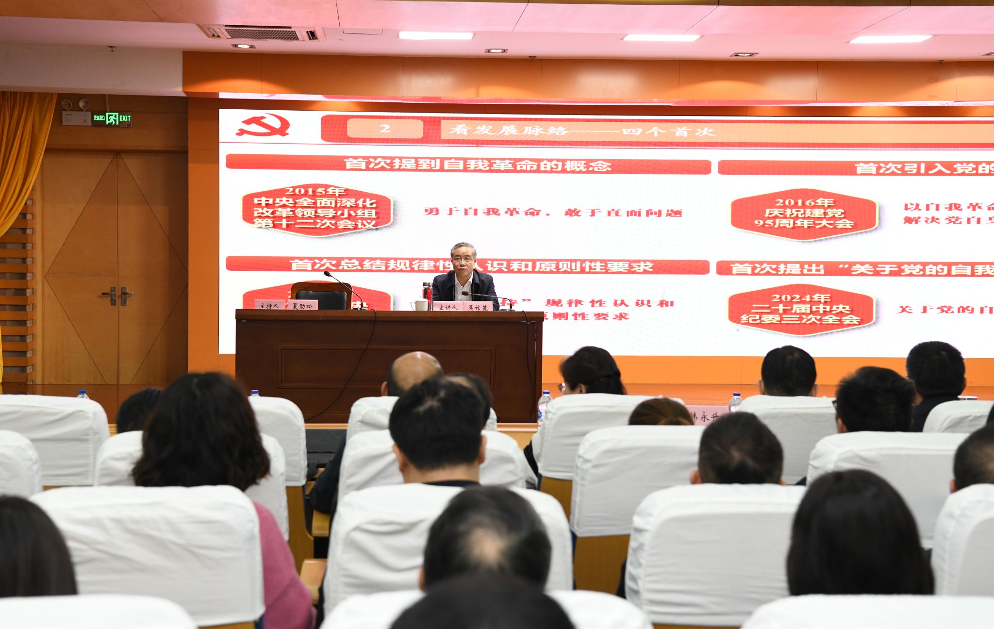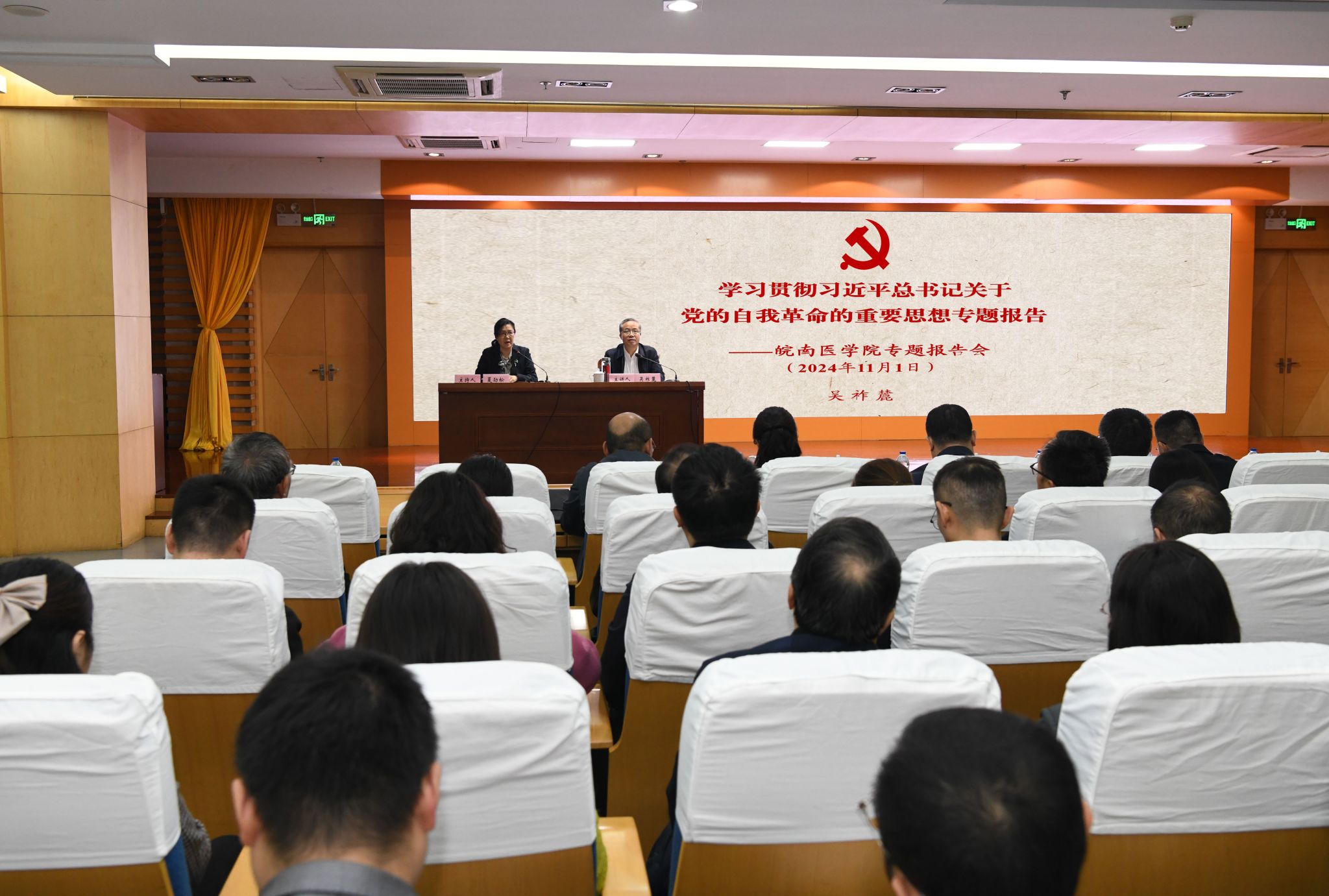 11月1日上午,伟德国际1946源于英国在图书信息大楼学术报告厅召开“学习贯彻习近平总书记关于党的自我革命的重要思想”专题辅导报告会暨党委理论学习中心组学习(扩大)会议,邀请芜湖市委常委、市纪委书记、市监委主任吴祚麓作专题辅导报告。会议由校党委书记夏劲松主持,校党委常委姚应水、贾贤燕、文育锋、王保中、韩永升、陈晓宏、邹莹出席报告会。