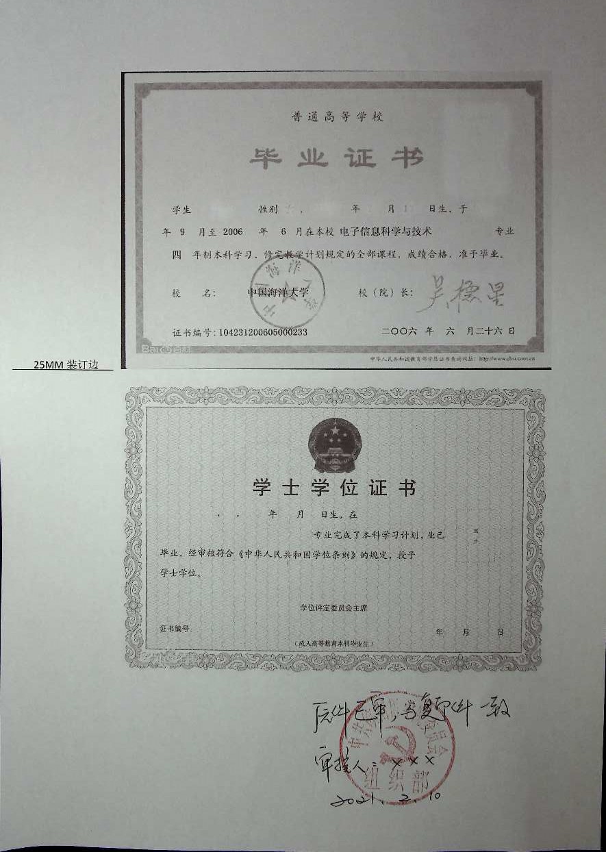 根据组通字[2012]28号文,干部人事档案材料采用国际标准A4纸型(297X210mm),材料左边应留有25mm装订边。学历学位证书按本科、硕士、博士学历层次分开扫描,以竖版格式将同层次学位证书、学历证书扫描在同张A4纸。省厅级及以上获奖证书原件分次竖版扫描在A4纸。