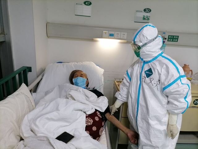 今天是2月24号,来到武汉已经一个星期了。第一天我分管的患者是一位84岁的老奶奶,她是武汉本地人,我跟她简单的介绍了自己,她拉着我的手说,“真是谢谢你们,你们从那么远的地方来救我们,太不容易了。”奶奶的老伴在这次疫情中去世了,儿子和媳妇也被隔离了,孙女在国外,一家人都不在一个地方,说着说着,奶奶的泪水就止不住的流了下来。听了她的诉说,我瞬间不知道该怎么去安慰她,只能紧紧的握着她的双手说,“奶奶,还有我们呢,我们就是你的家人,你有什么需要帮忙的尽管说,我们会照顾你的!”