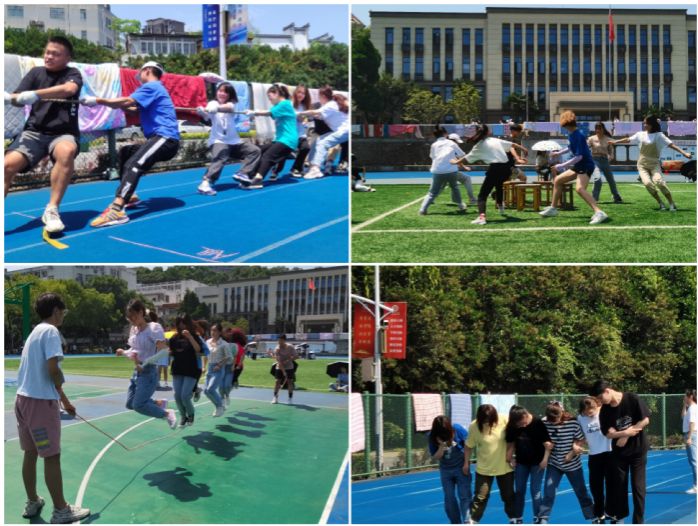 5月30号上午9:00,护理学院和人文管理学院在赭麓校区操场共同举办了以“心情深呼吸,健康晒太阳”为主题的心理素质拓展活动,活动包括趣味接力、一分钟跳大绳、抢凳子、你划我猜、趣味拔河五个项目,同学们纷纷自由组队积极参与。此次活动将心理健康教育与运动相结合,同学们在协作游戏的过程中,展现了健康积极的生活方式和良好的精神面貌。