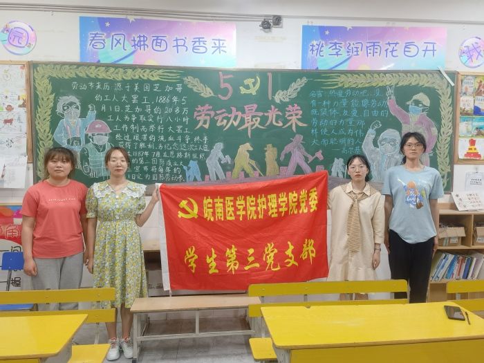 2021年5月10日,党支部成员走进安徽师范大学附属小学,和小朋友们一起同出黑板报,向他们讲述“五一”劳动节来历和小英雄们的故事,鼓励他们争做一名优秀的少先队员。