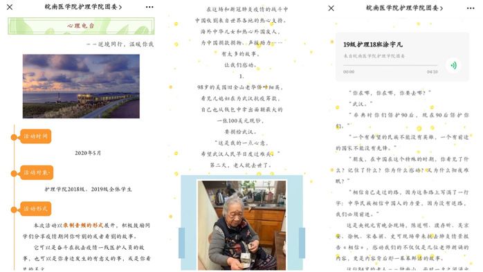 致敬逆行者,讲述身边事。疫情期间,出现了无数勇敢的逆行者,护理学院以“心理电台活动——疫情期间的那些人和事”为主题,用同学们的口述,将这些动人的事迹一一诉说。“心理电台”活动的举办,让同学们看到了背后默默付出的他们,见证了“逆”行者们的辛苦与感动。
